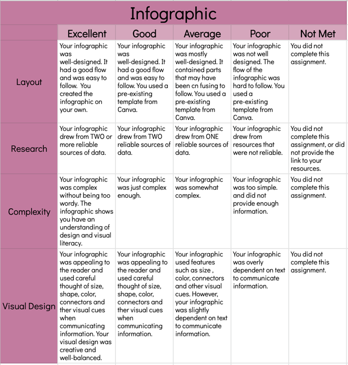 Task #2: The teacher will evaluate students based on their infographics. Students will also complete a rubric for 3 groups and provide feedback for each group. The quality of students’ evaluations for each other will also play a part in their overall grade for the assignment.
