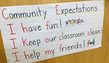 The students will sit on the rug during whole-group instruction time. The teacher will use chart paper to document all the responses of the students. Each student will have an opportunity to answer guiding questions while creating their ‘Community Expectations’.
