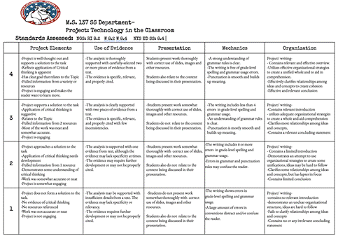 Day One: Recap/ Intro Goals for today: ❖ Watch a video on the implication of technology in the classroom. ❖ Discuss the the benefits/challenges of classroom technology ❖ How to Analyze the role of Classroom Technology (PPA Steps) ❖ Write a five to eight sentence paragraph answering this question “How does technology act as a benefit or a challenge in the classroom. Make sure to use the information from the video, your notes and your prior knowledge.” Day Two: Starting the Project Goals for today: ❖ As a class, we review the task and all the options students have. ❖ Students are to discuss how they want to complete the project. Those who choose to work in groups are to assign roles and fill in the student role sheet. ❖ Students are introduced to the checklist and the rubric (see below)